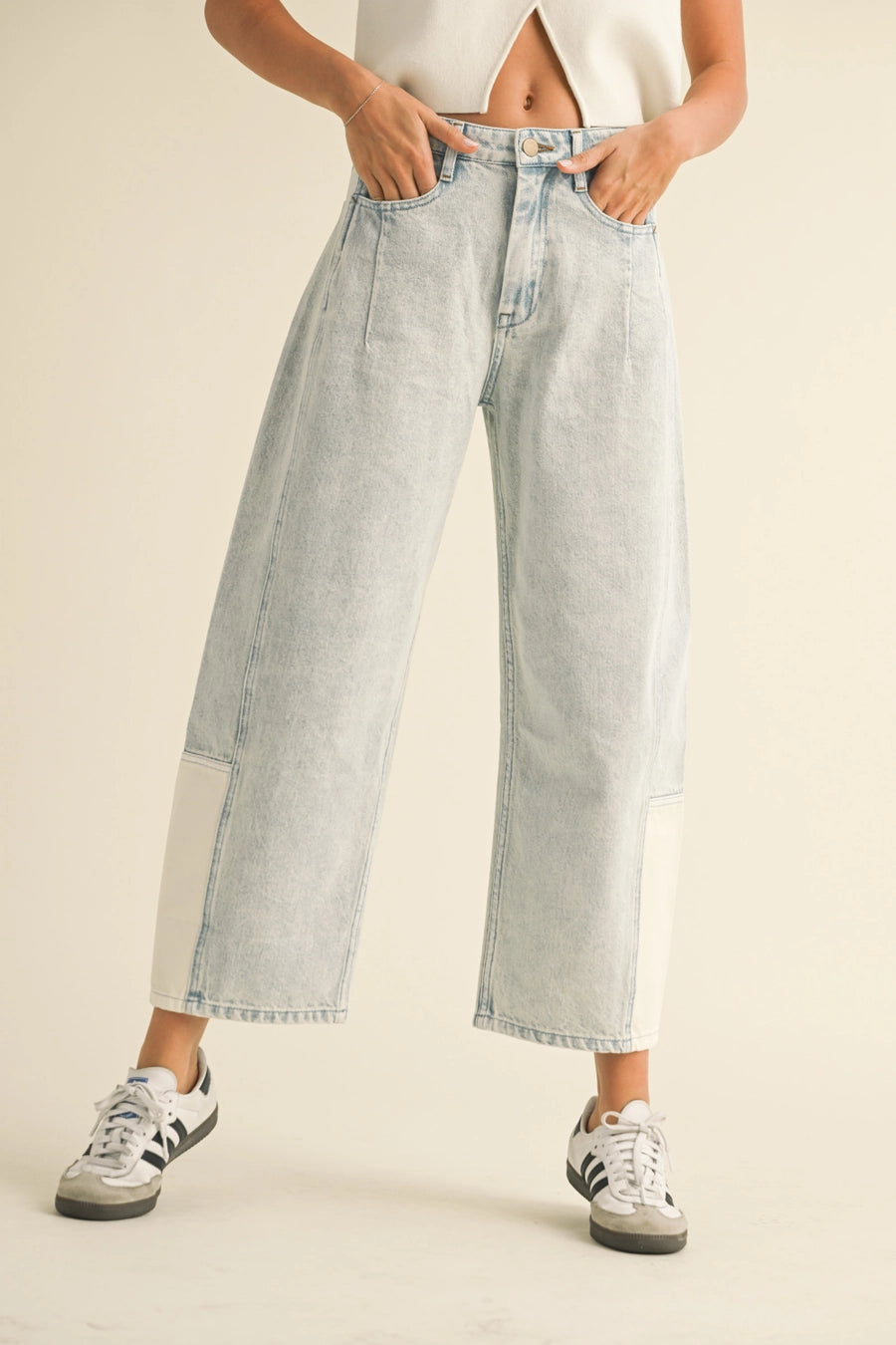 Get the best of both worlds with our Color and Fabric Combination Barrel Denim Pants. These pants feature a unique mix of colors and fabrics that will make you stand out in style. Perfect for the fashion-forward individual who wants to make a statement!
