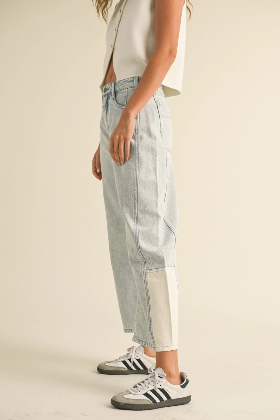 Color and Fabric Combination Barrel Denim Pants