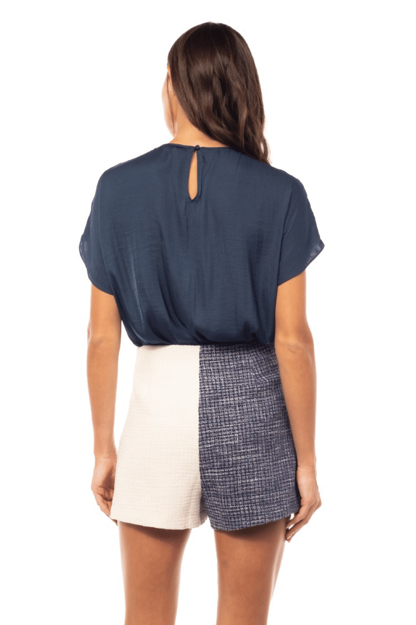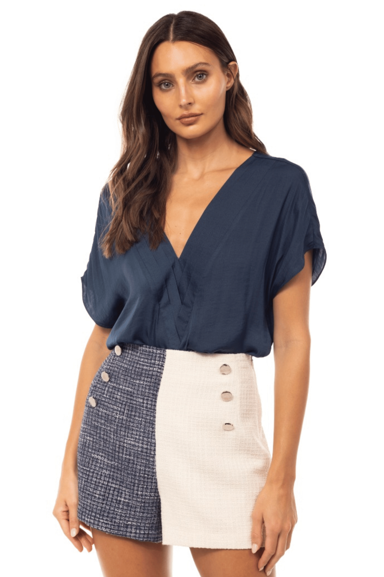 * Style No.: AB117451 Criss Cross Double V-neck Pleated Blouse Blouse with a crisscross double V-neck and pleated short sleeves for a chic and modern look. The crisscross detailing at the neckline adds a touch of contemporary flair, while the pleated short sleeves provide a stylish and structured aesthetic. This blouse effortlessly combines trendy elements for a fashionable and versatile wardrobe piece. Fabric: Woven 100% POLYESTER Hand Wash Cold Sizes in Pack:2S-2M-2L