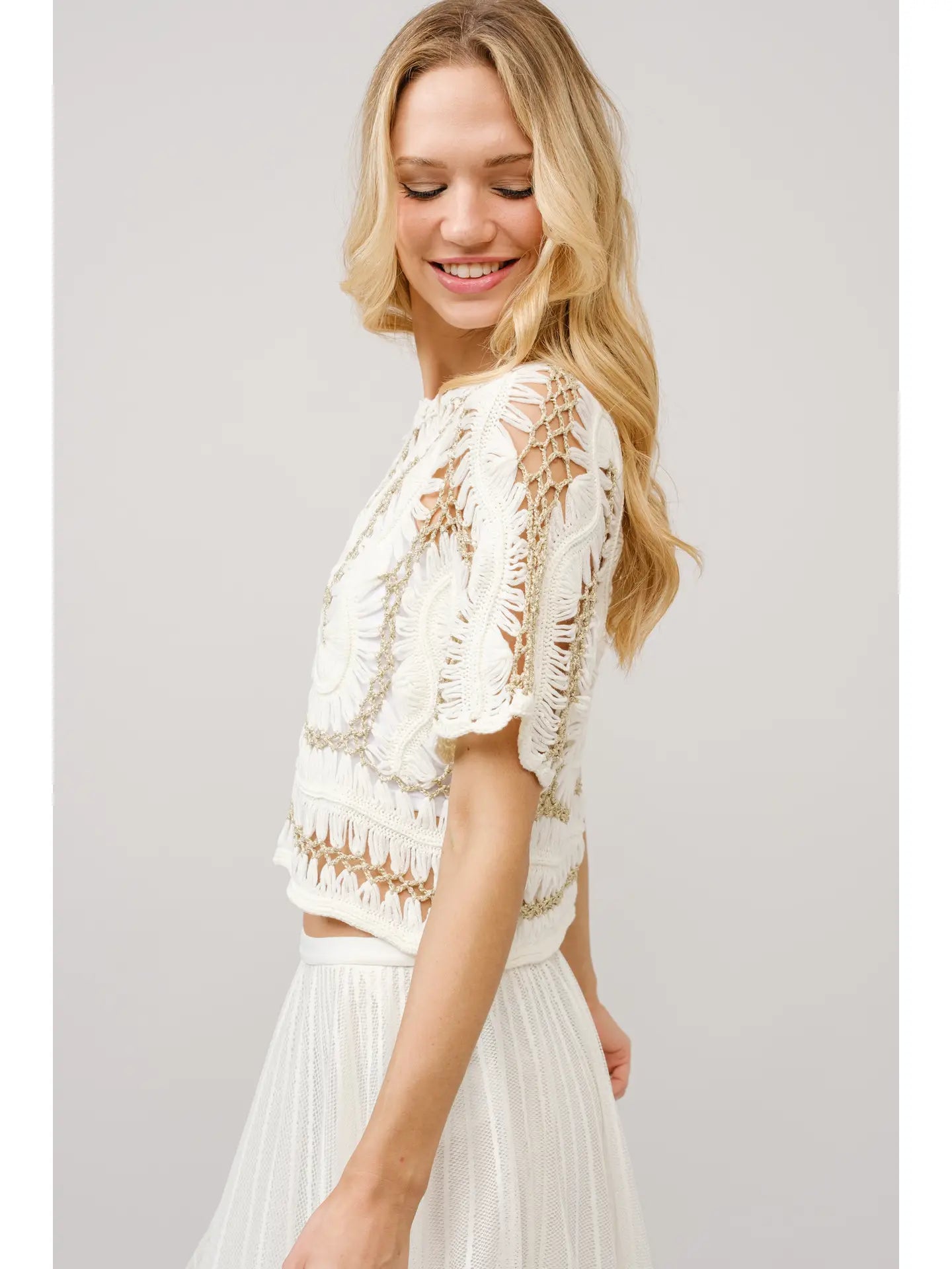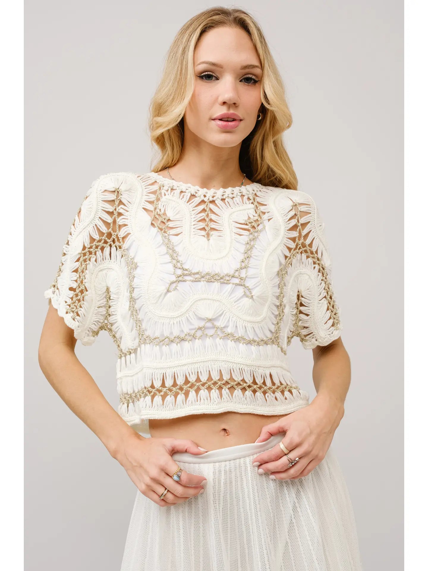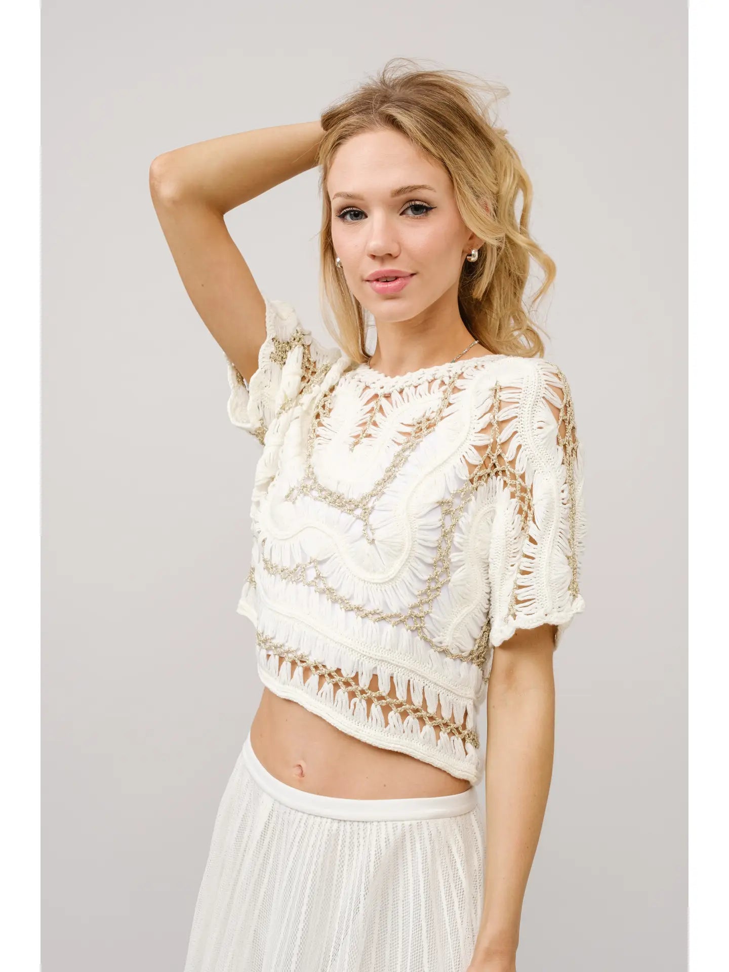 Shimmer and shine in this playful crochet crop top! Woven with eye-catching metallic threads, this knitted piece adds a touch of sparkle to any outfit. Perfect for festivals, beach days, or pairing with high-waisted bottoms for a night out. This handcrafted stunner lets you flaunt your style with a fun, flirty edge.
