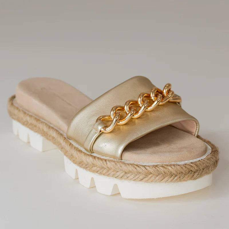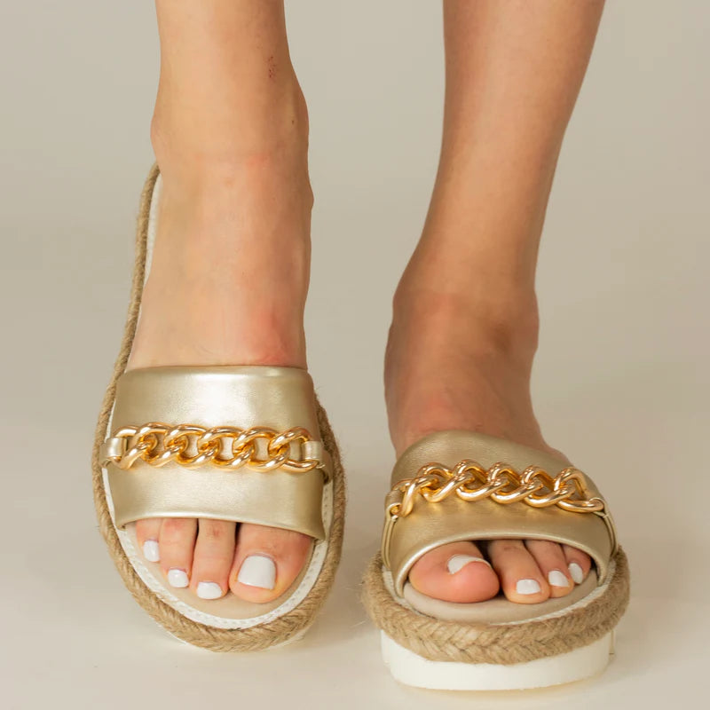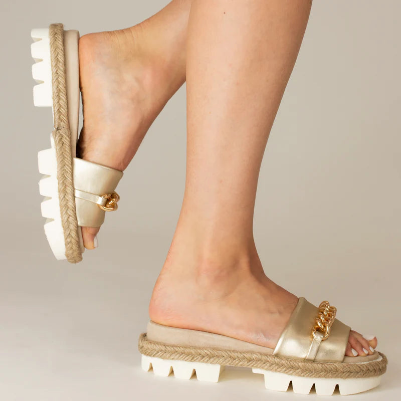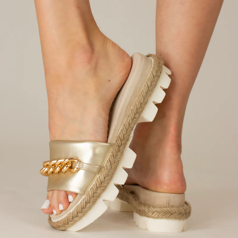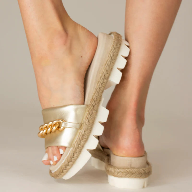 The Bardot summer sandal will be your everyday choice for every occasion. It features a exquisite fabric upper with a delicate gold chain . The white lite lug bottom is wrapped with natural jute trim resting on a elevated footbed wedge. The luxurious design is further enhanced by the soft kid sued wrapped foot. Whether running errands , attending casual gatherings, or simply enjoying a leisurely day out, the Bardot provides the perfect blend of style and comfort.