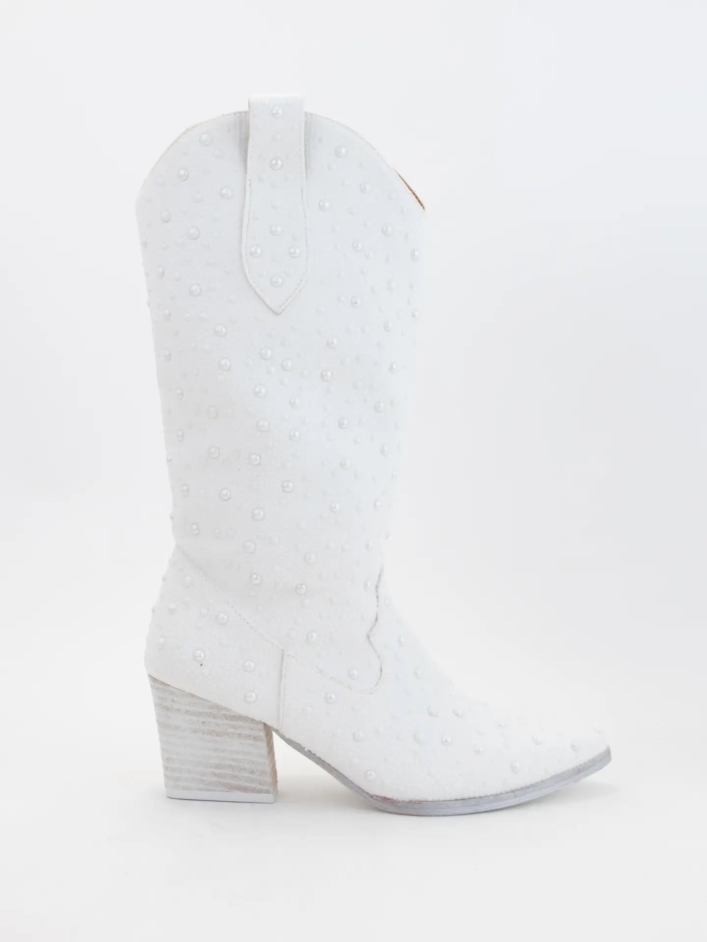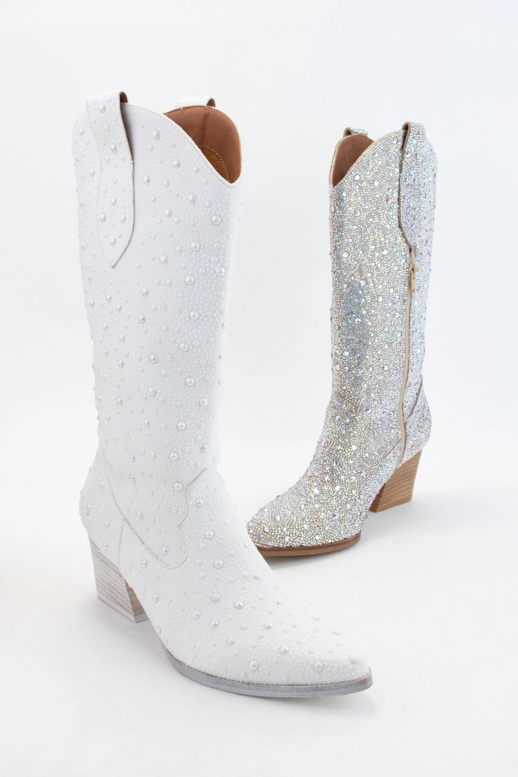 Step into the spotlight with these dazzling mid-calf western boots, sparkling with rhinestone jewels that catch every eye. The elegant white pearl color adds a touch of glam to your look, perfect for making a bold, playful statement wherever you go. Comfortable and stylish, these boots bring a fun twist to classic western flair.