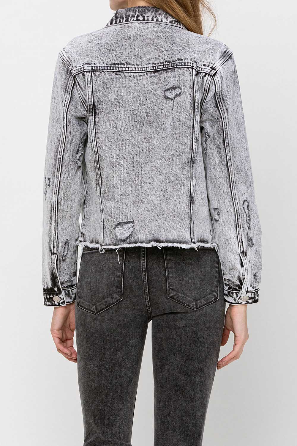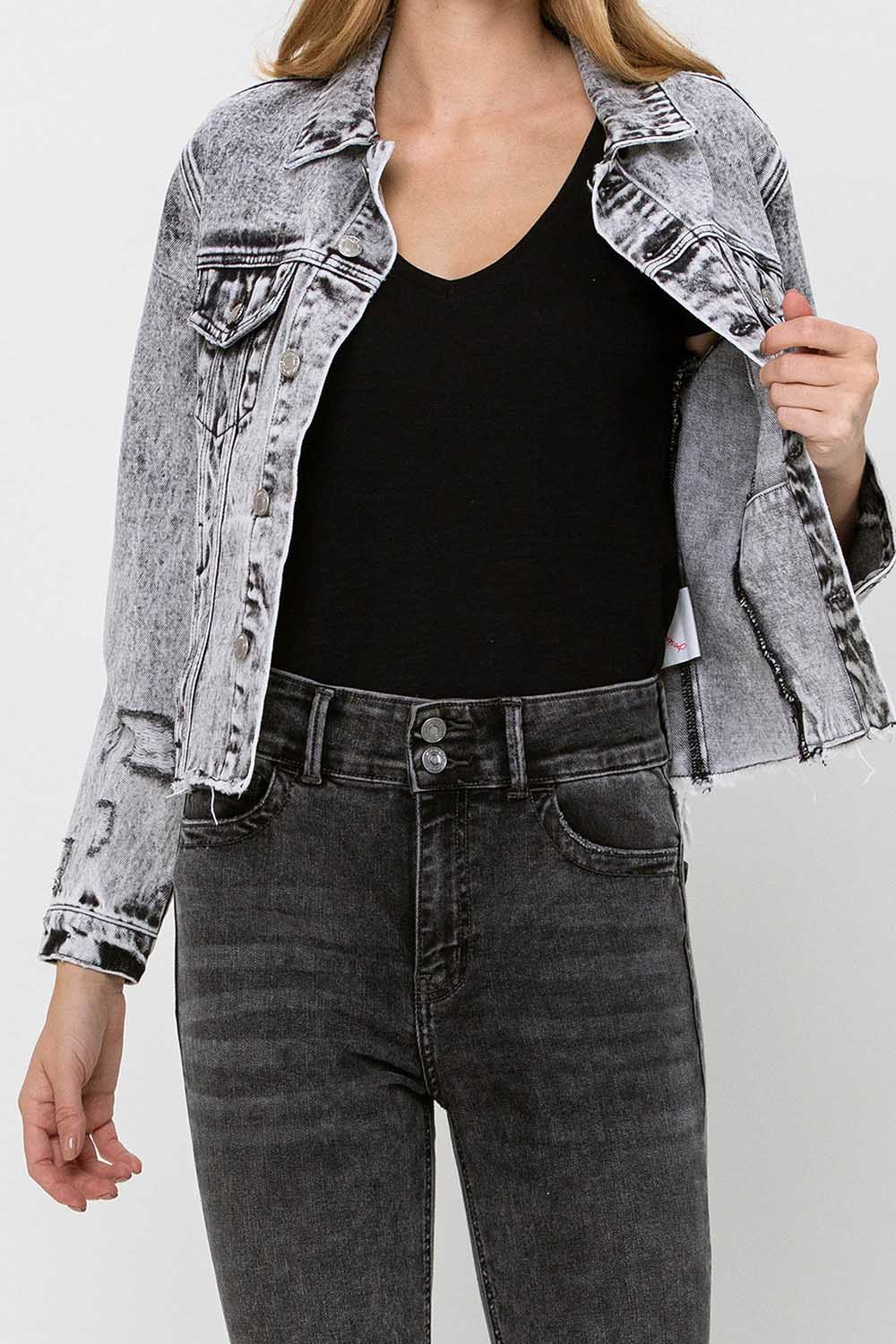 Distressed black acid wash classic crop denim jacket Non stretch denim, distressed detail, acid washed, deconstructed with a raw hem, cropped length, authentic rigid jeans texture, single button closure at cuff, denim jacket Bust: 36 1/2" / total length: 21 3/4'' / sleeve length: 23'' Model is 5'10'' wearing size s