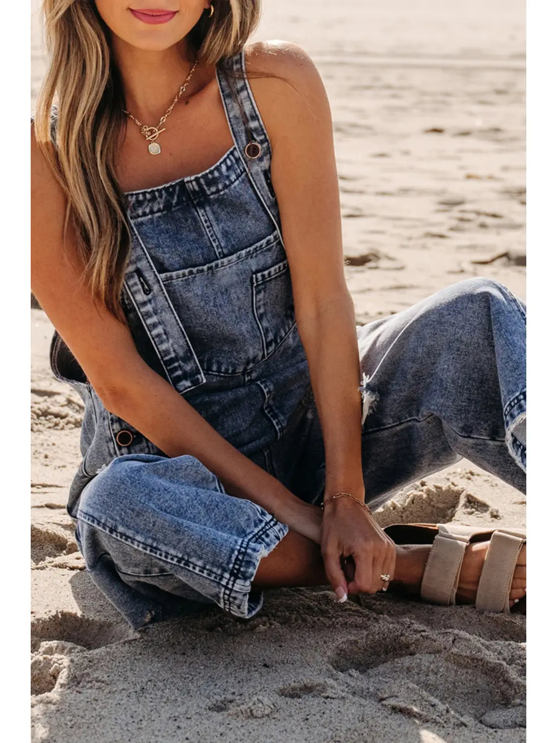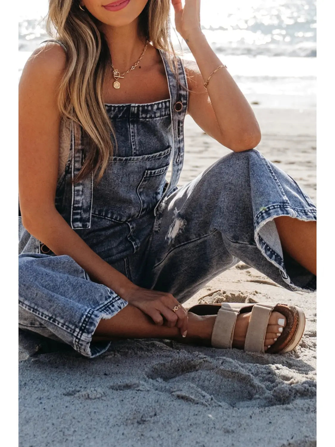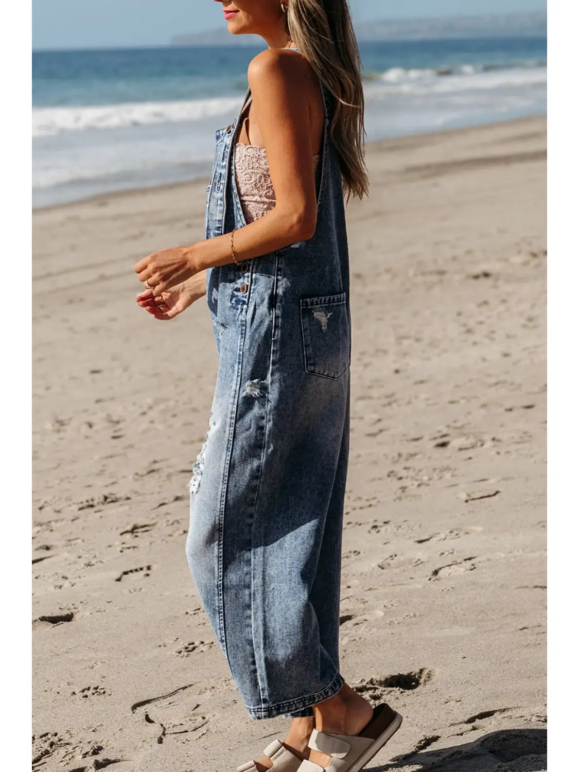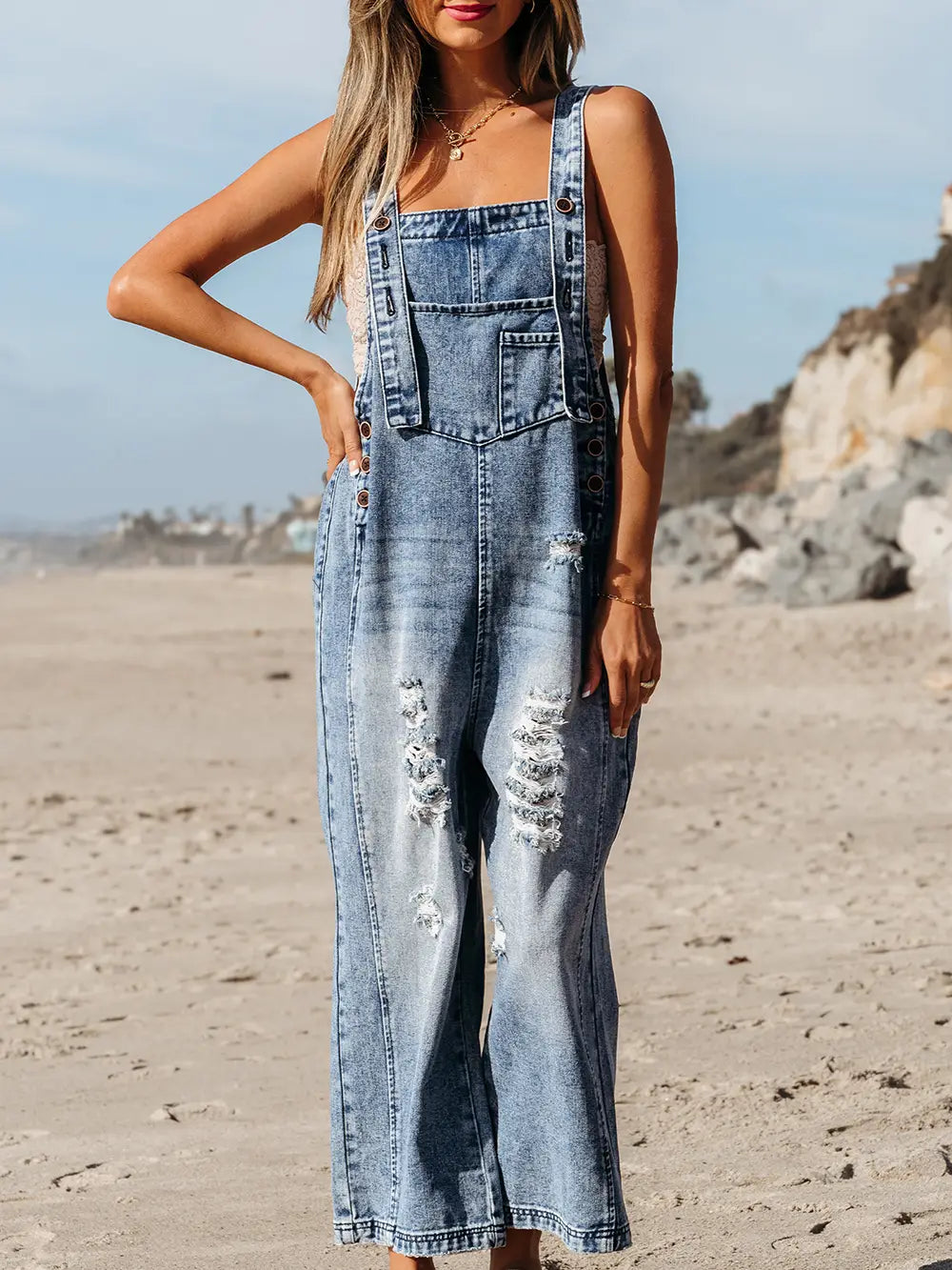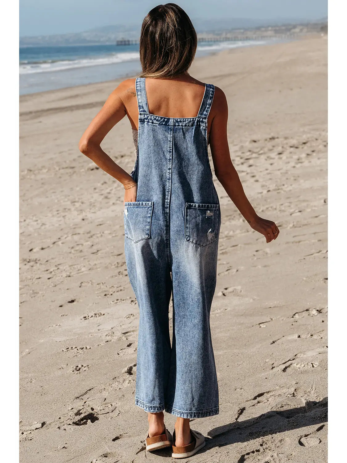 Distressed Pocketed Wide Leg Capri Denim Overall