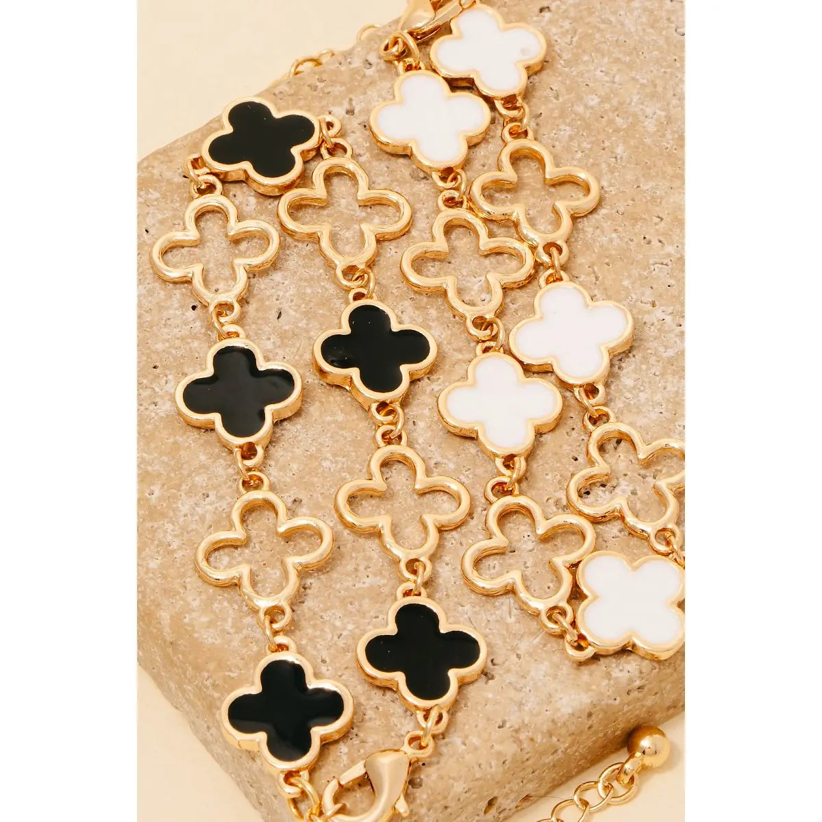 Add some playful flair to your wardrobe with this Epoxy and Metallic Clover Chain Bracelet. The unique chain design, combined with the durable epoxy and metallic materials, make this bracelet a stylish and long-lasting addition to any outfit. Show off your playful side with this quirky and fun accessory!