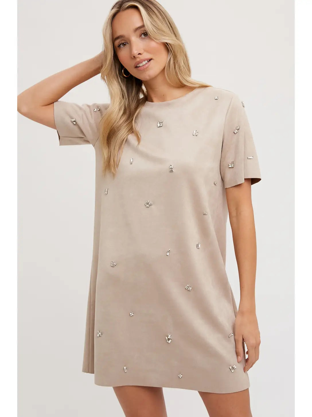 Step out in style with this Rhinestone Faux Suede Shift Dress. Its soft faux suede fabric feels luxe, while sparkling rhinestones add just the right amount of glam. The easy shift silhouette keeps things comfy and effortless, making it your go-to for everything from brunch dates to dance floors. It’s playful, chic, and ready to turn heads wherever you go!