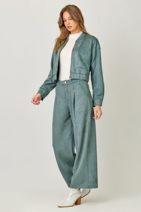 Add a dash of cool to your look with this suede bomber jacket! Featuring a smooth zipper front closure and handy chest pockets for your secret stashes, it’s designed to keep you comfy with long sleeves and buttoned cuffs that add a cheeky finishing touch. Who said suede can’t have fun?