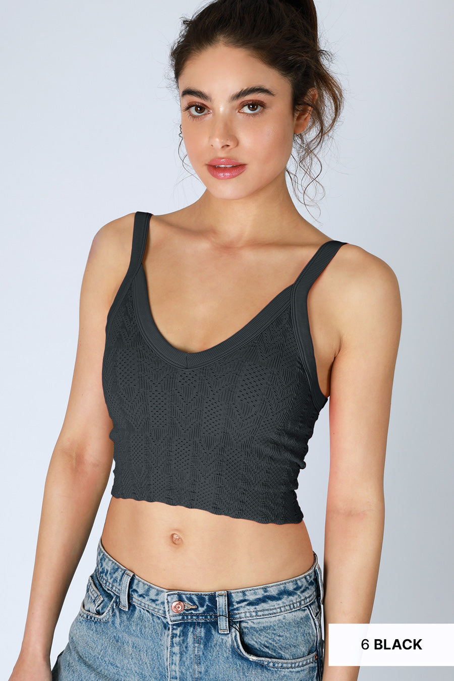 Lace Textured Crop Top with V-Neck Add a touch of femininity to your wardrobe with this lace textured crop top featuring a flattering V-neckline. The delicate lace texture adds elegance and sophistication, while the cropped cut keeps it modern and stylish. Perfect for layering or wearing solo for a chic, standout look. Fabric: 92% Nylon / 8% Spandex Made in USA Double-layered for support and coverage This top features a double-layered inner construction for added support and a smooth fit. The intricate lace texture provides both style and comfort, making it a versatile piece for any occasion.