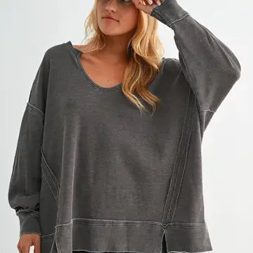 Embrace effortless style with our Oversized Waffle-Knit Distressed Long Sleeve. This piece features a unique mineral wash and raw edges at the seam lines for an edgy, worn-in look. The slits at the hem create a flowy, relaxed fit, while inverted pleats at the sleeve cuffs add fullness, giving the sleeves a subtle yet stylish volume. Perfect for layering or wearing on its own, this top is a go-to for those who love a blend of comfort and fashion-forward design. Logan is 5'9", a size 2, and is wearing an S