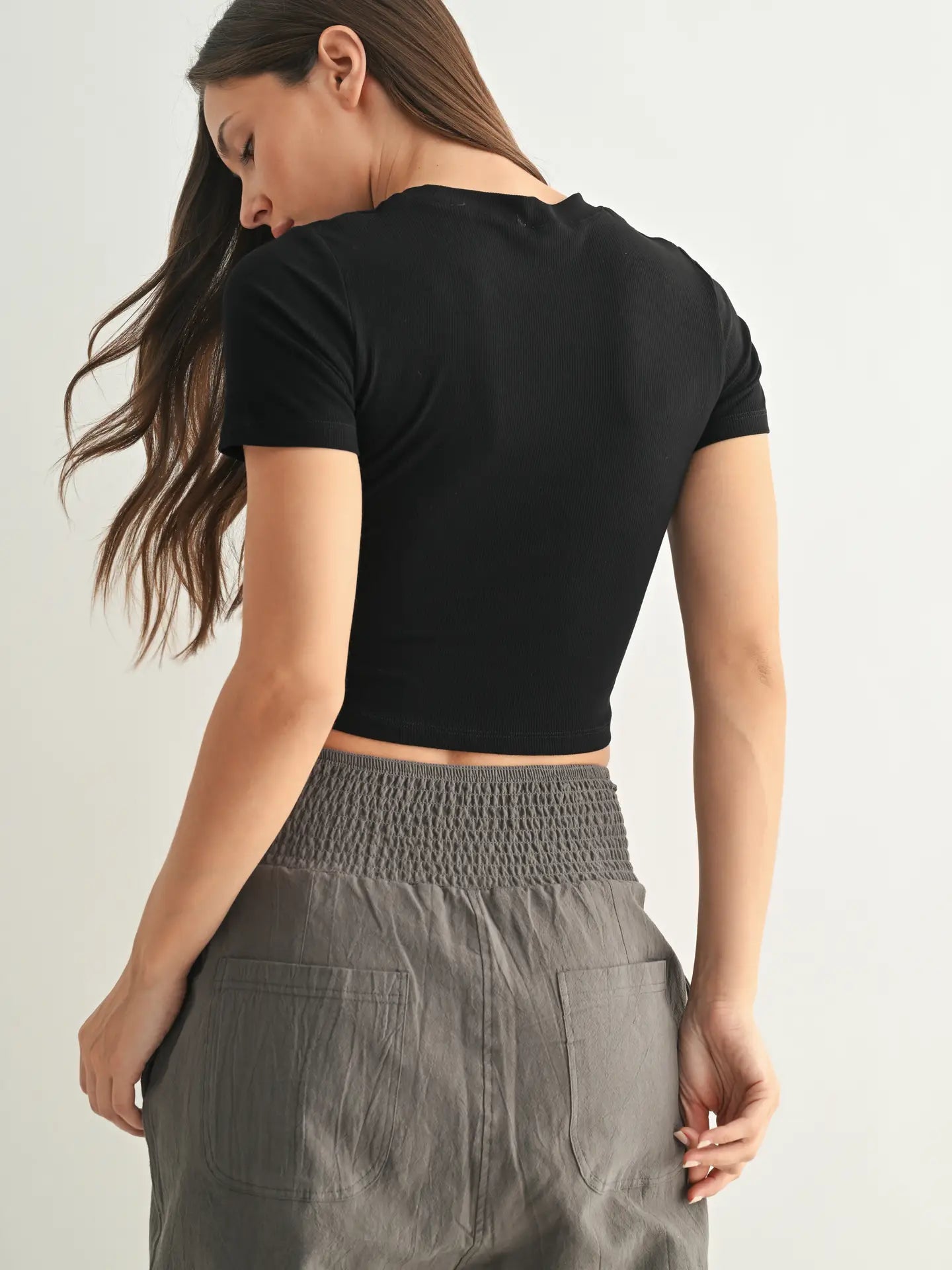 Whether as a workout top (worn over a Mono B sports bra and a pair of Mono B leggings) or as a cute top (matched with a denim item), this cropped tee is as versatile as it is comfortable. It has short sleeves, a rounded neckline, and a form-fitting silhouette. Abby, in Black, is 5'8.5", a size 2, and is wearing an S 93% rayon, 7% spandex. Four-way stretch. Made in Vietnam.